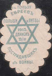 1915 г. 19.03.1915 г. Виньетка в форме овала разм. 31 х 44 мм с фи-гурными краями. Одноцветная печать на белой бумаге. В центре шестиконечная звезда, в центре которой текст в три строки: «1915 Двинск 19/III». Сверху текст в три строки: «В пользу евреев Польши и Литвы». Внизу продолжение текста в д…