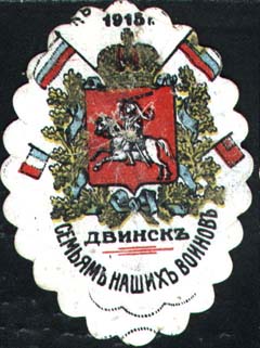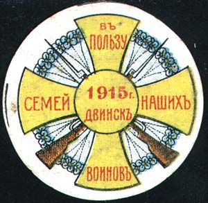 1915 г. Круг диаметром 49 мм. Многоцветная печать на белой бумаге. В центре на фоне венка из цветов и скрещенных винтовок крест ополченца. На перекладинах креста текст: «В пользу семей наших воинов». В центре креста текст в две строки: «1915 г. Двинск».