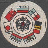 1916 г. Круг диаметром 26,5 мм. Многоцветная печать на белой бумаге. На сплошном фоне из точек в круглой рамке диаметром 11 мм герб России. По окружности флаги стран-союзниц России в Первой мировой войне.