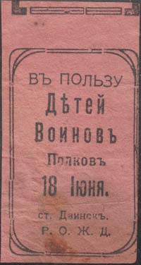 1916(?) г. Разм. рамки 31 х 49 мм. Одноцветная печать на бледно-розовой бумаге. В двойной декоративной рамке в центре текст в семь строк: «В пользу детей Воинов Полков. 18 Июня. Ст[анция]. Двинск. Р.О.Ж.Д.».