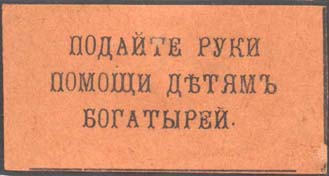 1915(?) г. Разм. 55 х 28 мм. Одноцветная печать на оранжевой бумаге. В центре текст в три строки: «Подайте руки помощи детям богатырей».