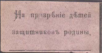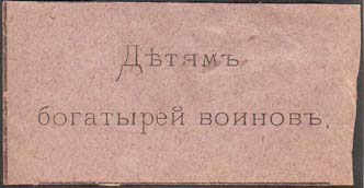 1915(?) г. Разм. 55 х 28 мм. Одноцветная печать на серо-розовой бумаге. В центре текст в две строки: «Детям богатырей воинов».