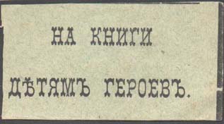 1915(?) г. Разм. 55 х 28 мм. Одноцветная печать на зелено-серой бумаге. В центре текст в две строки: «На книги детям героев».
