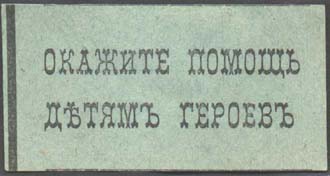 1915(?) г. Разм. 55 х 28 мм. Одноцветная печать на зеленой бумаге. В центре текст в две строки: «Окажите помощь детям героев».