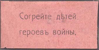 1915(?) г. Разм. 55 х 28 мм. Одноцветная печать на бумаге различных цветов. В центре текст в две строки: «Согрейте детей героев войны».