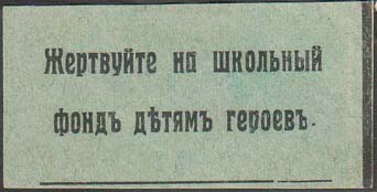 1915(?) г. Разм. 55 х 28 мм. Одноцветная печать на бумаге различных цветов. В центре текст в две строки: «Жертвуйте на школьный фонд детям героев».