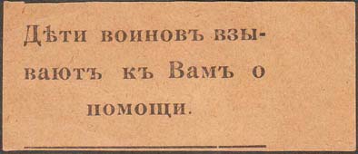 1915(?) г. Разм. 55 х 28 мм. Одноцветная печать на бумаге различных цветов. В центре текст в три строки: «Дети воинов взывают к Вам о помощи».