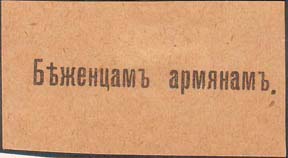 1915(?) г. Разм. 55 х 28 мм. Одноцветная печать на желтой бумаге. В центре текст: «Беженцам армянам».
