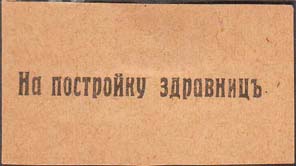 1915(?) г. Разм. 55 х 28 мм. Одноцветная печать на желтой бумаге. В центре текст: «На постройку здрав-ниц».