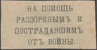 1915(?) г. Разм. 55 х 28 мм. Одноцветная печать на серо-зеленой бумаге. В центре текст в четыре строки: «На помощь разоренным и пострадавшим от войны».