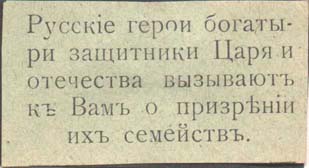 1915(?) г. Разм. 55 х 28 мм. Одноцветная печать на серо-зеленой бумаге. В центре текст в пять строк: «Русские герои богатыри защитники Царя и отечества взывают к Вам о призрении их семейств».