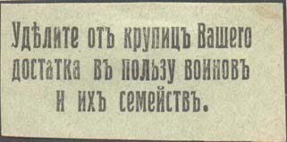 1915(?) г. Разм. 55 х 28 мм. Одноцветная печать на серо-зеленой бумаге. В центре текст в три строки: «Уделите от крупиц Вашего достатка в пользу воинов и их семейств».