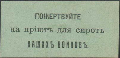 1915(?) г. Разм. 70 х 28 мм. Одноцветная печать на зеленой бумаге. В центре текст в три строки: «Пожертвуйте на приют для сирот наших воинов».