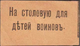 1915(?) г. Разм. 55 х 30 мм. Одноцветная печать на бумаге различных цветов. В центре текст в две строки: «На столовую для детей воинов».
