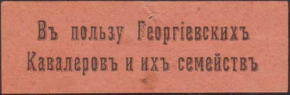 1915(?) г. Разм. 70 х 20 мм. Одноцветная печать на оранжевой бумаге. В центре текст в две строки: «В пользу Георгиевских Кавалеров и их семей».
