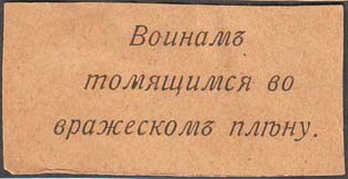 1915(?) г. Разм. 55 х 30 мм. Одноцветная печать на бумаге различных цветов. В центре текст в три строки: «Воинам томящимся во вражеском плену».
