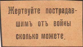 1915(?) г. Разм. 55 х 28 мм. Одноцветная печать на желтой бумаге. В центре текст в три строки: «Жертвуйте пострадавшим от войны сколько можете».
