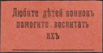 1915(?) г. Разм. 55 х 28 мм. Одноцветная печать на бумаге различных цветов. В центре текст в три строки: «Любите детей воинов помогите воспитать их».
