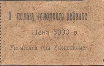 1922 г. Разм. 59 х 38 мм. Левосторонняя зубц. 11 1/4. Одноцветная печать на желто-серой тонкой бумаге низкого качества. Текст в три строки: «В пользу голодного ребенка. Цена 5000 р. Укомголод при Уисполкоме».