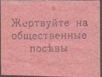 1915(?) г. Разм. 31 х 23 мм. Одноцветная печать на розовой бумаге. Текст в три строки: «Жертвуйте на общественные посевы».