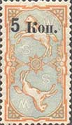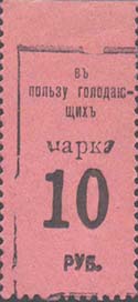 1917 г. Разм. 17 х 41 мм. Одноцветная печать на розово-красной бумаге. Зубц. 11 1/2. Текст в шесть строк: «В пользу голодающих Марка 1 руб.».