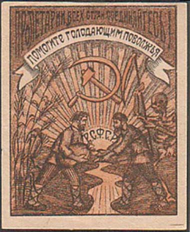 1922(?) г. Разм. 60 х 72 мм. Двухцветная печать на тонкой кремовой бумаге. В прямоугольной рамке разм. 54 х 67 мм аллегорический рисунок, символизирующий победу над голодом. На фоне восходящего солнца с аббревиатурой «Р.С.Ф.С.Р.» крестьянин передает голодающему мешок с хлебом. Сверху серп и молот…