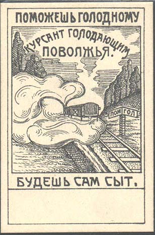 1922(?) г. Разм. 51 х 78 мм. Одноцветная печать на толстой белой бумаге. В центре в прямоугольной рамке разм. 45 х 72 мм уходящий вдаль по рельсам поезд. На указателе текст: «Помгол». Над рисунком текст в две строки: «Курсант голодающим Поволжья». Выше и ниже рисунка текст: «Поможешь голодному – …