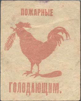 1922(?) г. Разм. 44 х 56 мм. Одноцветная печать на сероватой бумаге. В центре изображение петуха с колосом в клюве. Текст: «Пожарные голодающим».