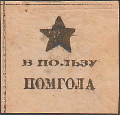 1922(?) г. Разм. 60 х 56 мм. Одноцветная печать на желтоватой бумаге. В центре пятиконечная звезда. Ниже текст в две строки: «В пользу помгола».
