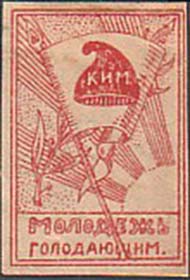 1922(?) г. Разм. 26 х 37 мм. Одноцветная печать на желтоватой бумаге. В двойной прямоугольной рамке знамя с неразборчивым рисунком на полотнище на фоне лучей восходящего солнца. Внизу текст в две строки: «Молодежь голодающим».