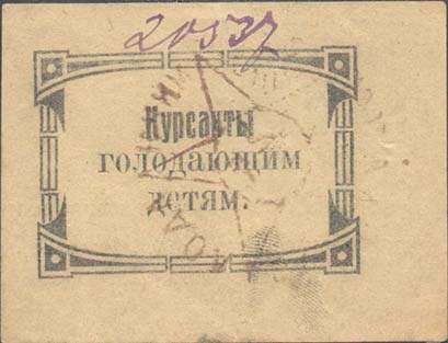 1922(?) г. Разм. рамки 35 х 19 мм. Одноцветная печать на бумаге различных цветов. В прямоугольной декоративной рамке текст в три строки: «Курсанты голодающим детям». На лицевой стороне оттиск круглой печати с пятиконечной звездой и неразборчивым текстом.