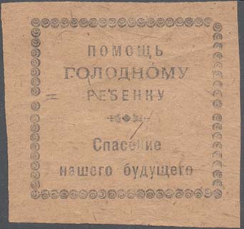 1922(?) г. Разм. рамки 45 х 43 мм. Одноцветная печать на светло-коричнево-желтой оберточной бумаге. В прямоугольной рамке из декоративных элементов сверху текст в три строки: «Помощь голодному ребенку». В центре декоративный элемент. Внизу продолжение текста в две строки: «Спасение нашего будущег…