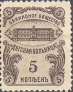 1914(?) г. Разм. 24 х 30 мм. Двухцветная двухсторонняя печать на сероватой бумаге. Зубц. 11 1/2. На лицевой стороне вид здания больницы. Внизу и в углах номинал. Текст: «Бакинское общество «Детская больница»». На оборотной стороне текст в три строки снизу вверх: «Оторванная из книжки считается не…