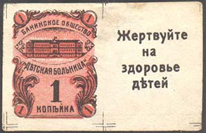 1914(?) г. Разм. 49 х 30 мм. Двухцветная печать на сероватой бумаге. Слева вид больницы. По углам номинал в кружках. Текст: «Бакинское общество «Детская больница»». Ниже номинал: «1 копейка». На купоне слева различные тексты.