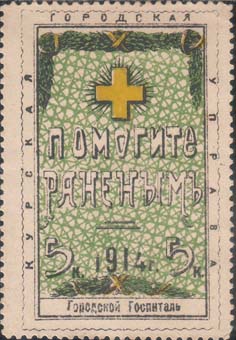 1914 г. Разм. рамки 33,5 х 53 мм. Трехцветная печать на белой бумаге. Зубц. 11 1/2. С клеем. В двойной прямоугольной рамке в центре текст в две строки: «Помогите раненым». Сверху гирлянда и знак Красного Креста. Внизу номинал и дата: «1914 г.». По периметру между рамками текст: «Курская Городская…