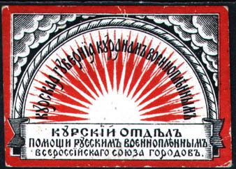 1916 г. Разм. 55 х 39 мм. Двухцветная печать на толстой желтоватой бумаге с мелованным верхним слоем. В центре на фоне лучей солнца полукругом текст: «Курская губерния курянам военно-пленным». Внизу на ленте текст в три строки: «Курский отдел помощи русским военнопленным Всероссийского Союза Горо…