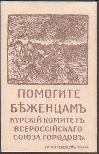 1915 г. Разм. 32 х 50 мм. Одноцветная печать на тол-стой белой бумаге. Сверху в рамке с закругленными краями группа беженцев на фоне города. Внизу текст в пять строк: «Помогите беженцам. Курский комитет Всероссийского Союза городов». Справа внизу выходные данные мелким шрифтом: «Т-во А.А. Левенсо…
