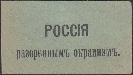 1915 г. Всероссийский сбор. Разм. 76 х 42 мм. Одноцветная печать на серо-зеленой бумаге. В центре текст в две строки: «Россия разоренным окраинам».