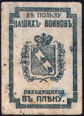 1915(?) г. Разм. 44 х 61 мм. Одноцветная печать на толстой желтоватой рыхлой бумаге. В тройной прямоугольной рамке разм. 37 х 54 мм в центре герб Курской губернии. Сверху текст в две строки: «В пользу наших воинов». Внизу продолжение текста в две строки: «Находящихся в плену».