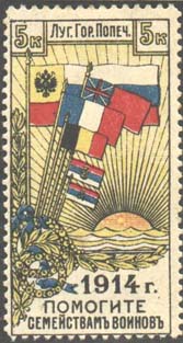 1914 г. Разм. рамки 24 х 48 мм. Многоцветная печать на белой бумаге. Зубц. 11 1/2. С клеем. В прямоугольной рамке в центре флаги стран-союзниц России в Первой мировой войне на фоне восходящего солнца. Сверху текст: «Луг[анское]. Гор[одское]. Попеч[ительство]. Внизу текст в три строки: «1914 г. По…