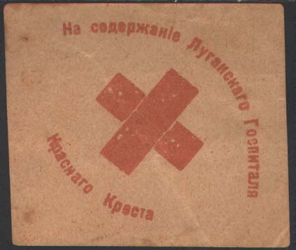 1916(?) г. Ромб неправильной формы разм. 91 х 90 мм. Одноцветная печать на желтоватой бумаге. В центре красный крест. Сверху полукругом текст: «На содержание Луганского Госпиталя». Внизу полукругом продолжение текста: «Красного Креста».