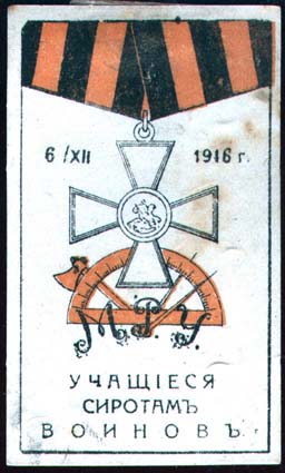 1916 г. 06.12.1916 г. Разм. рамки 37 х 66 мм. Двухцветная печать на белой бумаге. В прямоугольной рамке в центре на фоне транспортира, топора и циркуля аббревиатура: «М.Р.У.». Сверху Георгиевский крест на колодке и дата: «6/XII 1916 г.». Внизу текст в три строки: «Учащиеся сиротам воинов».