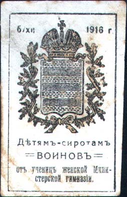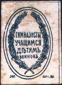 1915(?) г. Разм. 33 х 46 мм. Одноцветная печать на желтоватой бумаге. В центре в двойной овальной рамке разм. 27 х 39 мм в обрамлении венка текст в четыре строки: «Гимназисты учащимся детям воинов». Внизу мелким шрифтом выходные данные: «Лит. Зархина».