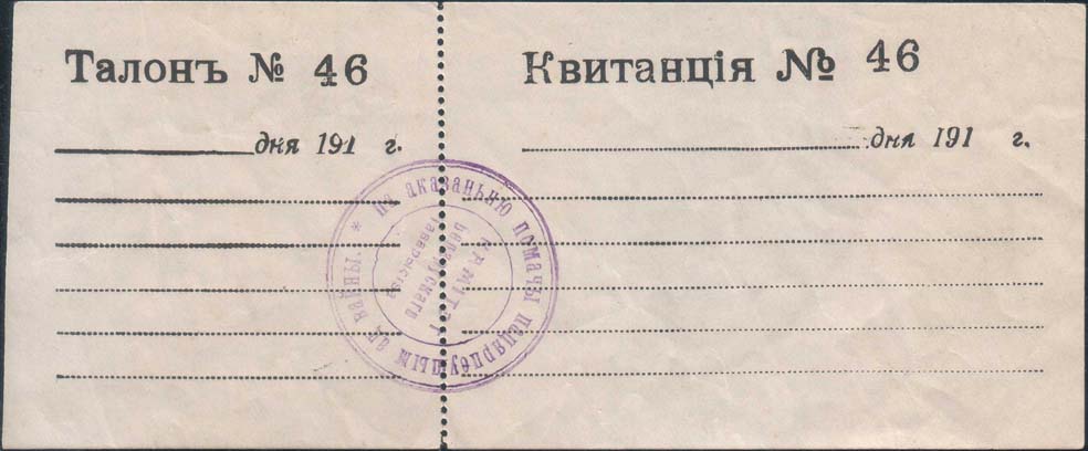 1917(?) г. Квитанция с корешком разм. 165 х 68 мм. Одноцветная печать на белой бумаге. Вертикальная зубц. 11 1/2. На квитанции сверху текст в две строки: «Квитанция №...(номер) ... дня 191... г.». Ниже пять строк из точек для рукописного текста. На талоне сверху текст в две строки: «Талон № ...(Н…