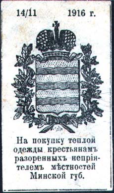 1916 г. 14.11.1916 Разм. 38 х 66 мм. Одноцветная печать на тонкой желтоватой бумаге. В центре герб Минской губернии. Сверху дата: «14/11 1916 г.». Внизу текст в пять строк: «На покупку теплой одежды крестьянам разоренных неприятелем местностей Минской губ[ернии]».
