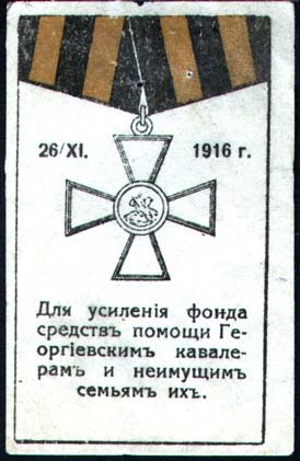 1916 г. 26.11.1916 г. Разм. рамки 38 х 66 мм. Двухцветная печать на тонкой белой бумаге. Сверху Георгиевский крест и дата: «26/XI 1916 г.». Внизу текст в пять строк: «Для усиления фонда средств помощи Георгиевским кавалерам и неимущим семьям их».