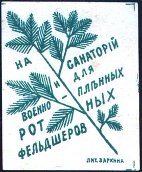 1916(?) г. Разм. 45 х 56 мм. Одноцветная печать на желто-ватой бумаге. Еловая ветка и текст в шесть строк: «На санаторий и для военнопленных рот-ных фельдшеров». Справа внизу мелким шрифтом выходные данные: «Лит. Зархина». По углам знака разграничительные линии.