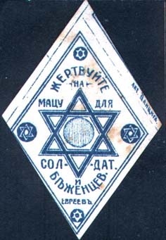 1917 г. 05.-06.03.1917 г. Ромб разм. рамки 33 х 49 мм. Одноцветная печать на белой бумаге. В центре шестиконечная звезда. По углам ромба декоративные элементы в виде шестиконечных звезд. Текст: «Жертвуйте на мацу для солдат и беженцев евреев». Слева внизу с наружной стороны рамки мелким шрифтом вы…
