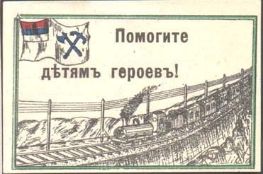 1915(?) г. Всероссийский сбор. Разм. рамки 56 х 35 мм. Многоцветная двухсторонняя печать на белой бумаге. На лицевой стороне в прямоугольной рамке в центре идущий поезд. В левом верхнем углу флаг Ведомства путей сообщения. Сверху текст в две строки: «Помогите детям героев!». На оборотной стороне т…