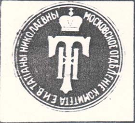 1915(?) г. Разм. 44 х 44 мм. Одноцветная печать на тонкой белой бумаге. В тройной круглой рамке в центре эмблема комитета. По внутреннему периметру рамки текст: «Московское отделение Комитета Е.И.В. Татьяны Николаевны».
